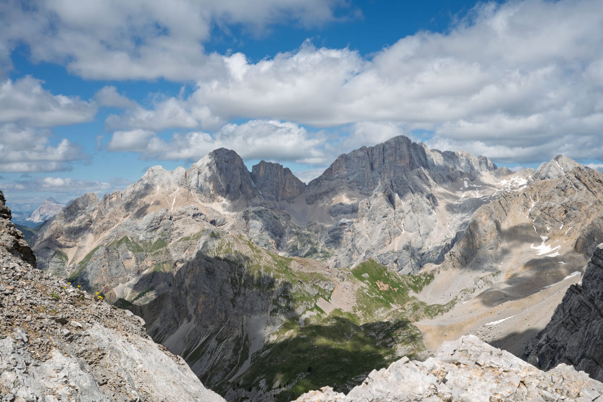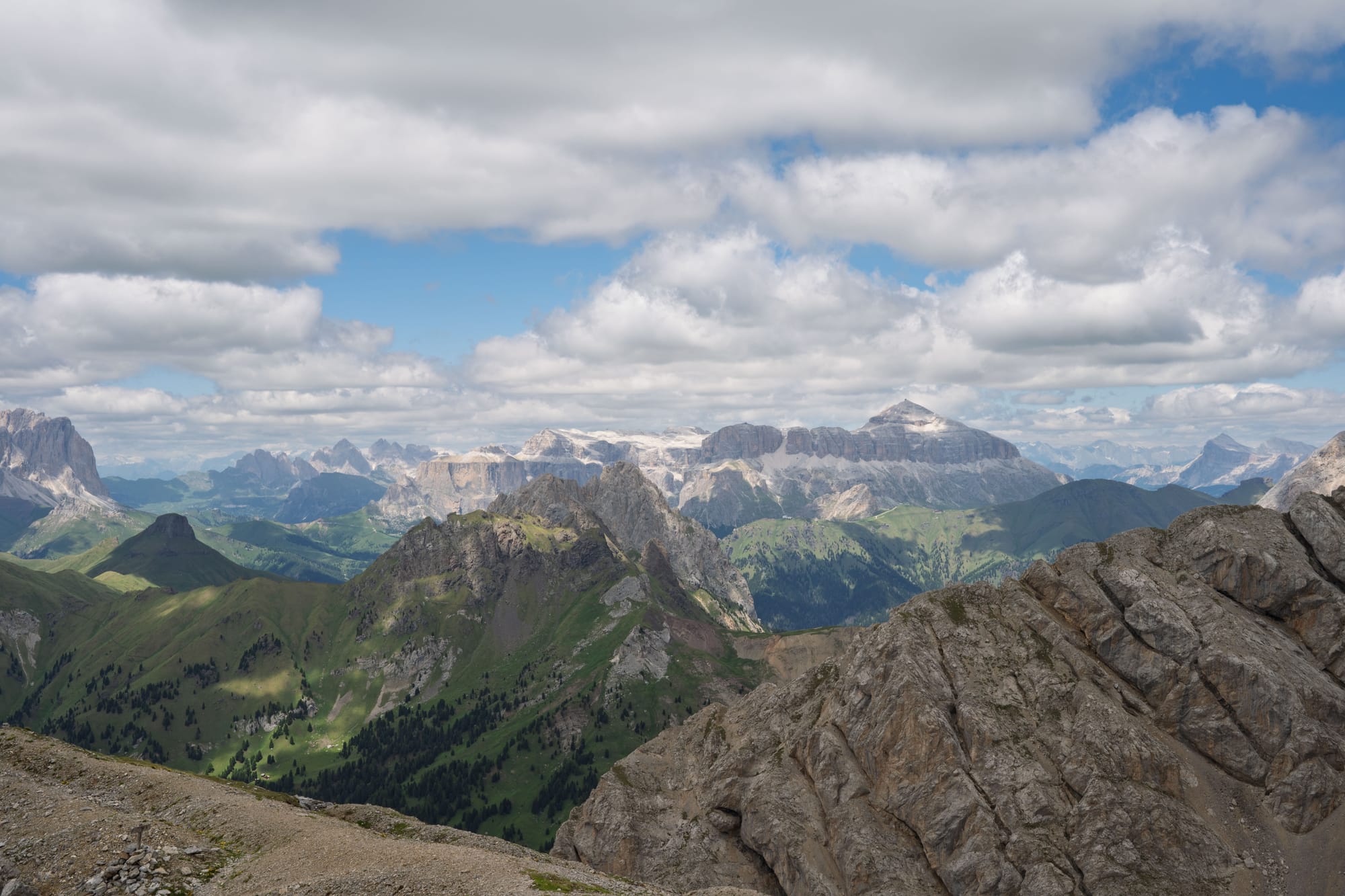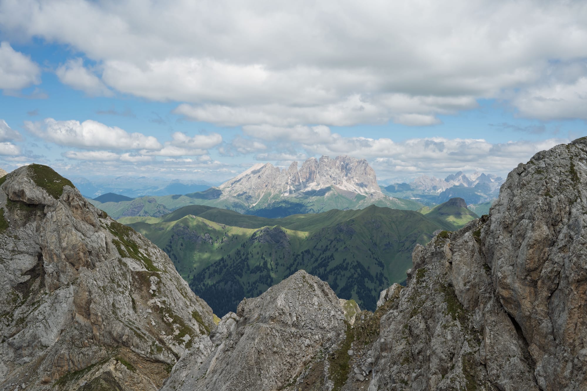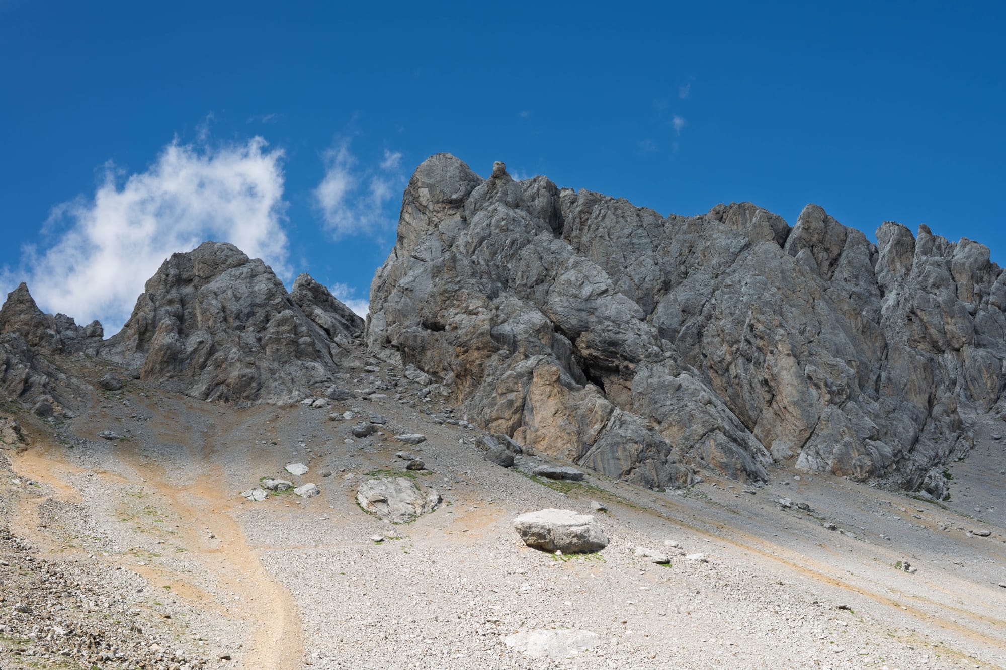 Raggiungiamo il Piccolo Lastel (2 697 m), seguito dal Grande Lastel (2 716 m). Camminiamo su una cresta affilata, superfici calcaree scolpite dagli agenti atmosferici (e probabilmente da diverse cannonate), finestre panoramiche sul Sassolungo, Catinaccio, Marmolada e Latemar.