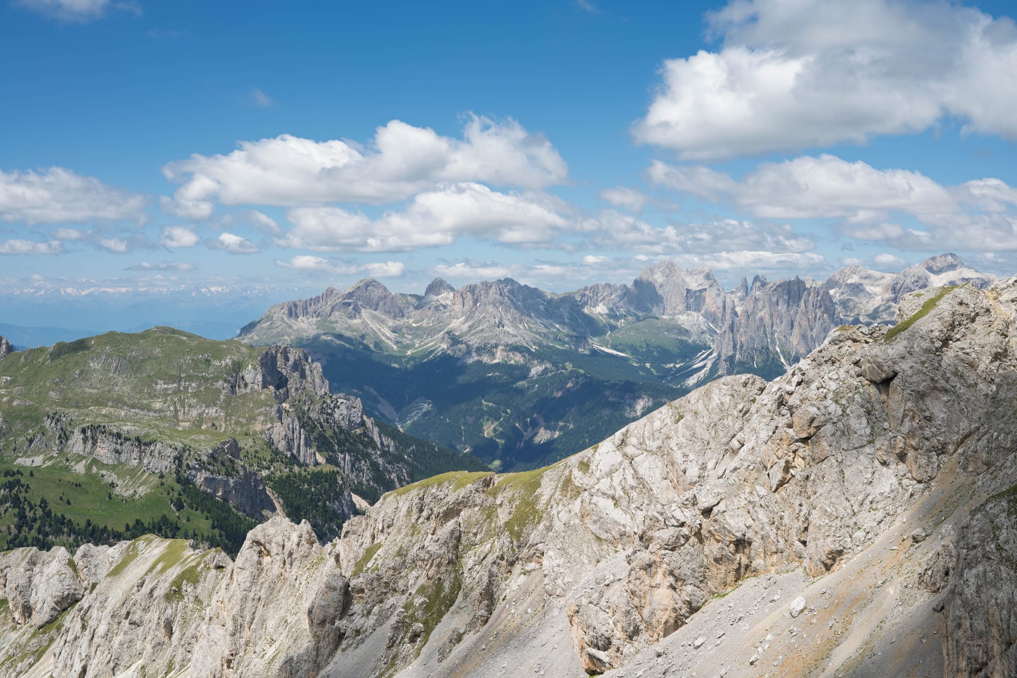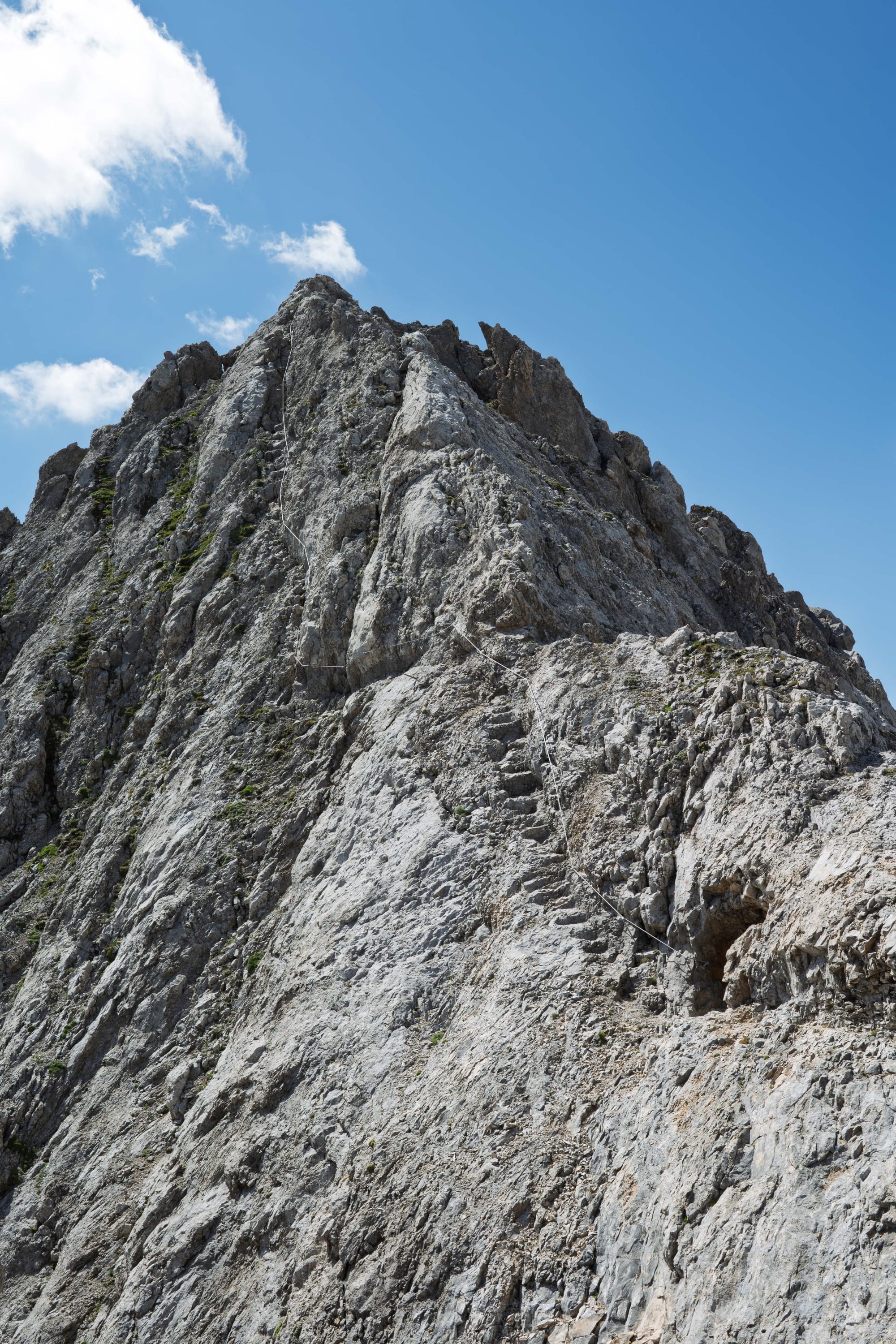 Negli ultimi metri verso la vetta, cordoni metallici aiutano il cammino su roccia esposta. La cima è un balcone su un fronte mutevole: una visuale spaziale sulle Dolomiti centrali.