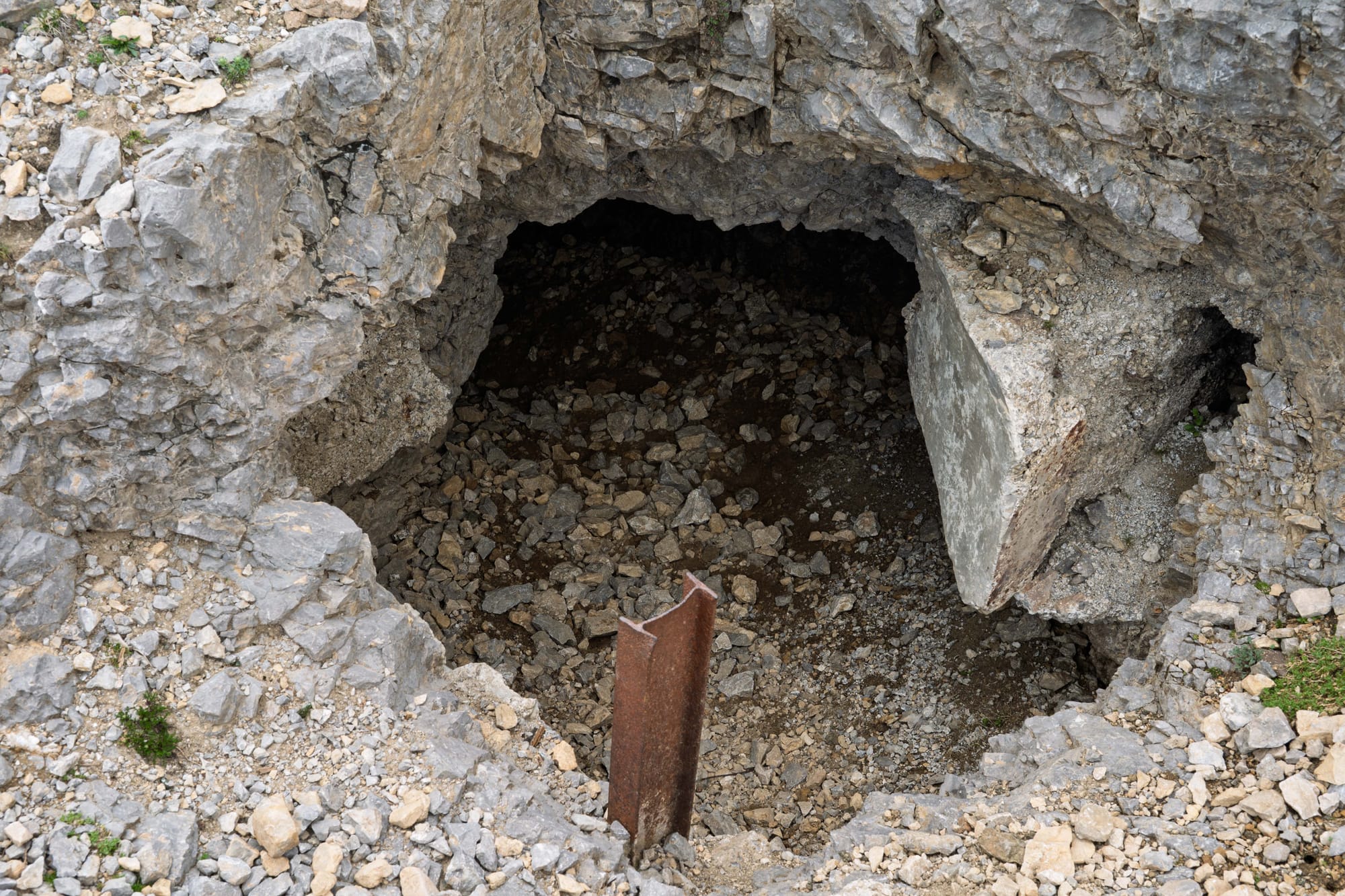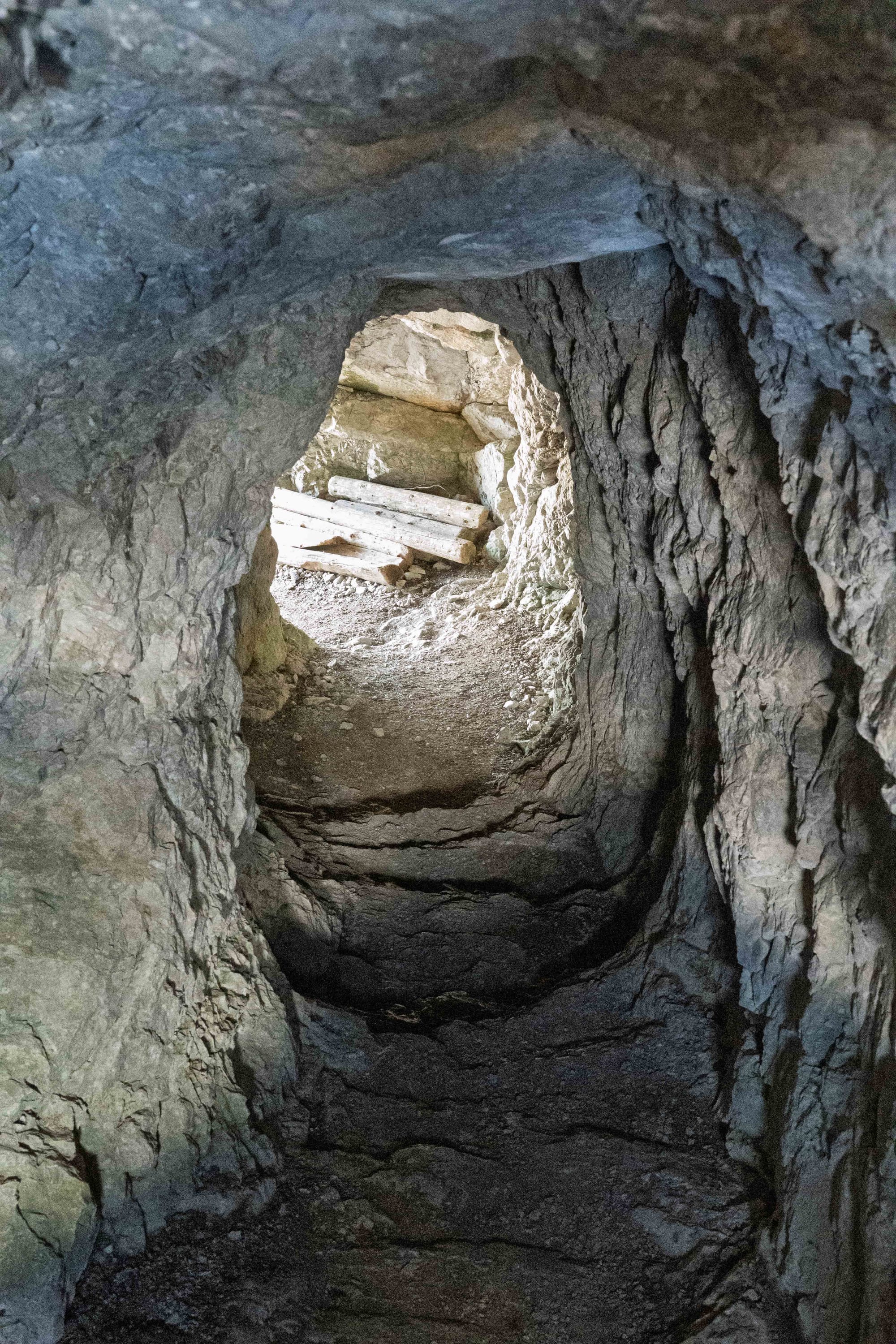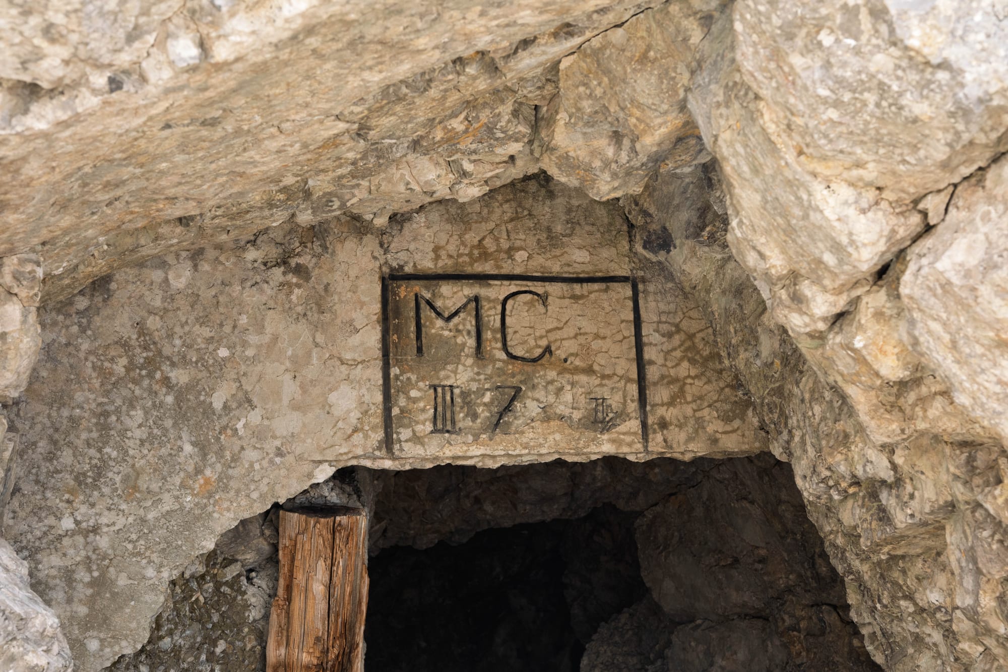 È il pozzo di mina del 1916: una camera sotto la linea nemica dove gli austriaci approntavano mine sotterranee puntando all’osservatorio italiano giù nel canale. Usciti, si incontrano i basamenti residui di mitragliatrici con feritoie: tracce di un inferno di ferro e polvere.