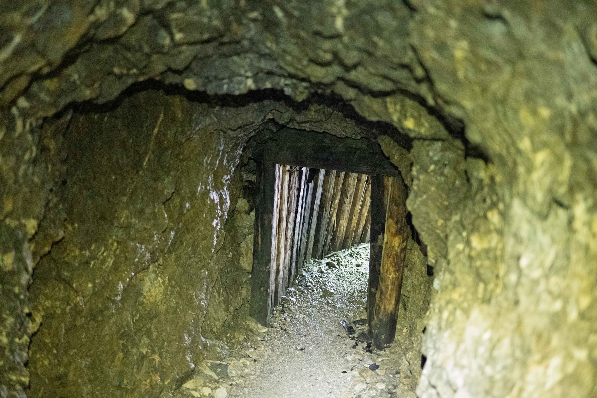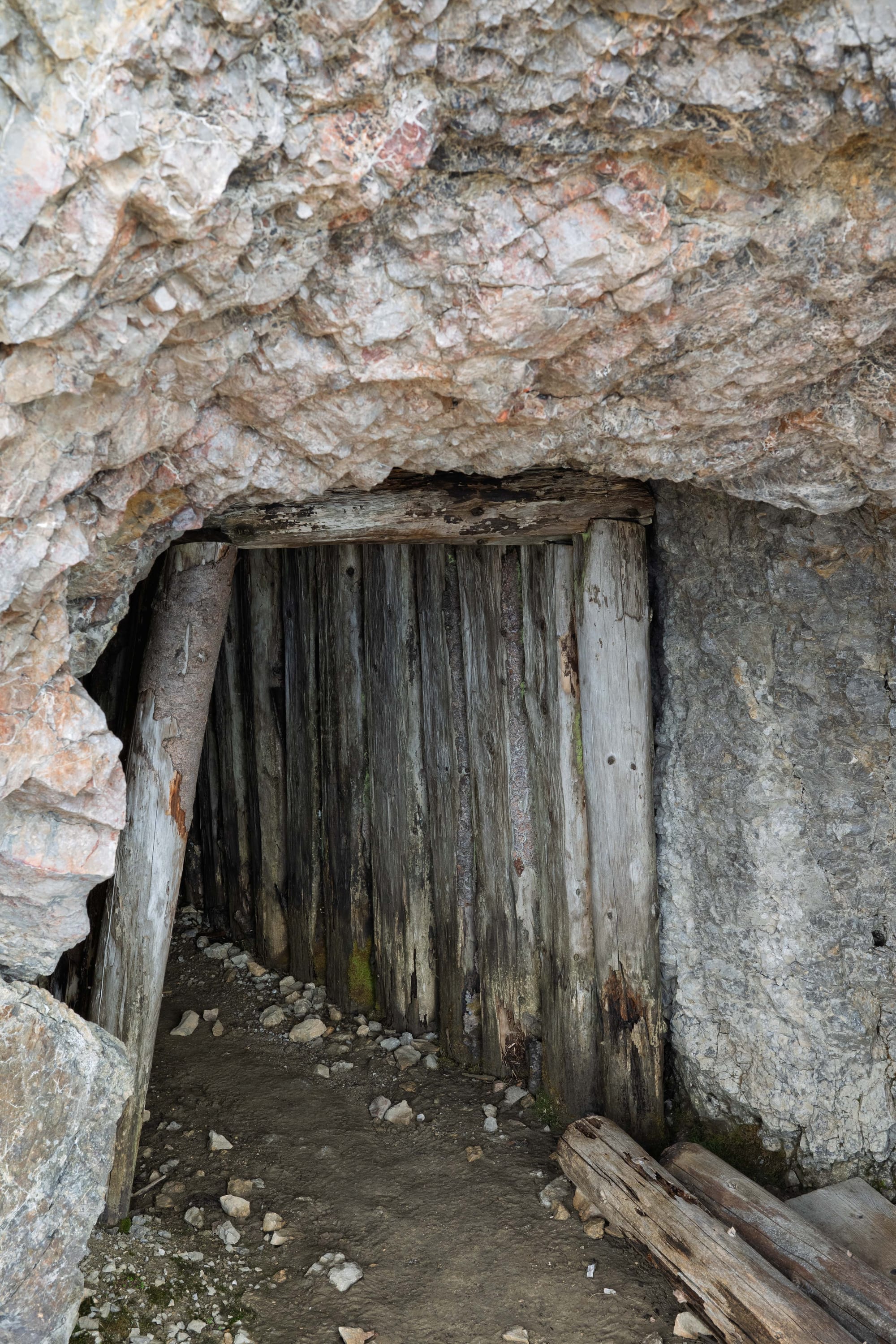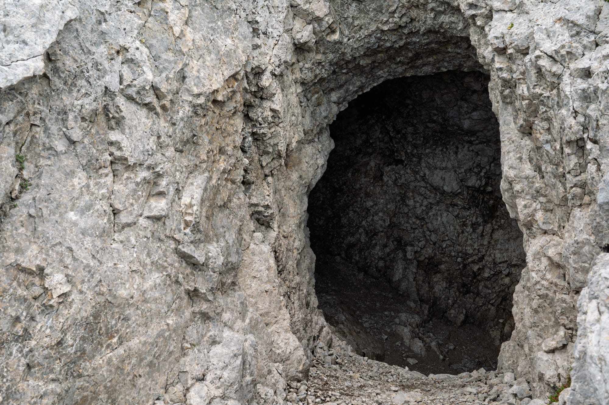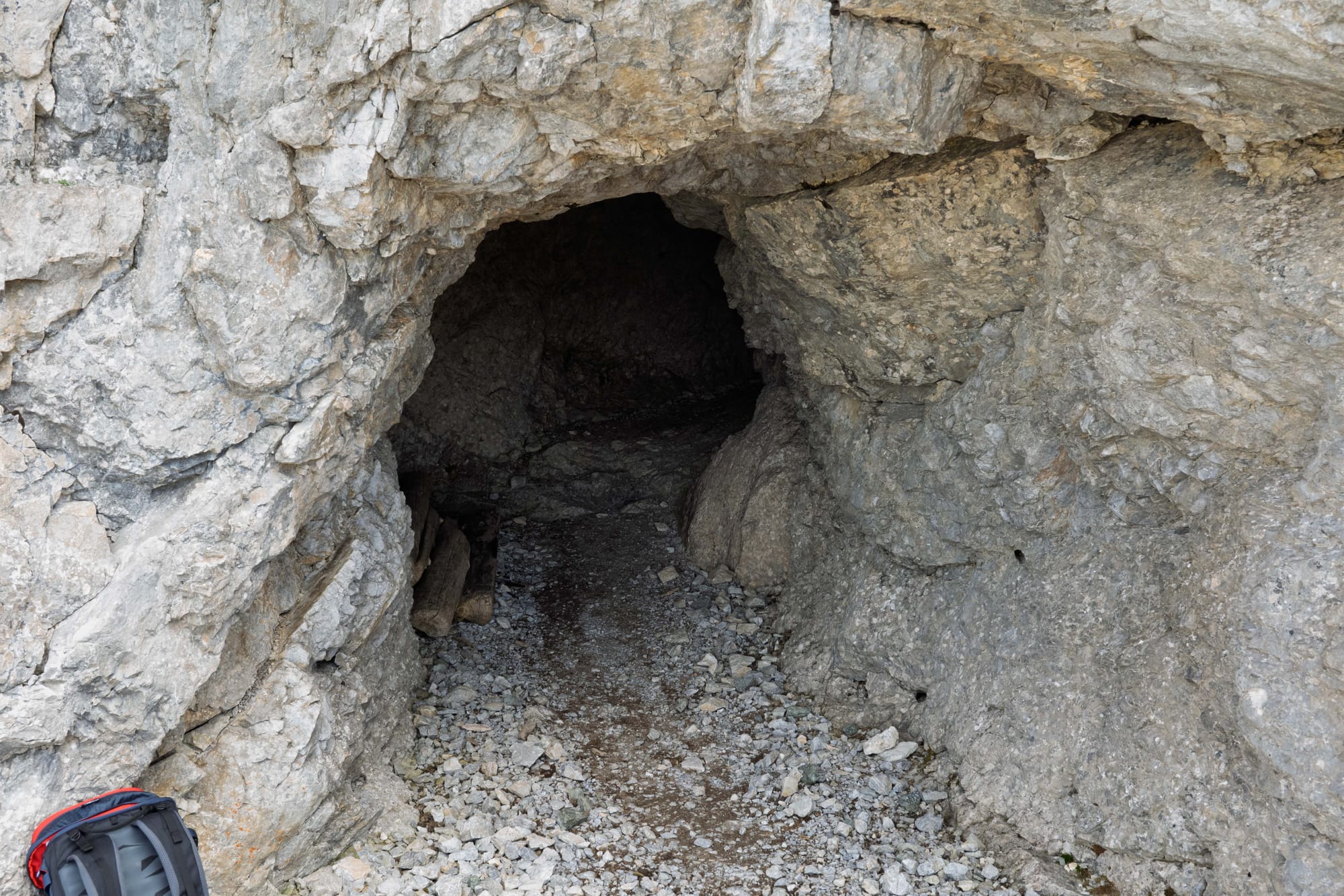 È il pozzo di mina del 1916: una camera sotto la linea nemica dove gli austriaci approntavano mine sotterranee puntando all’osservatorio italiano giù nel canale. Usciti, si incontrano i basamenti residui di mitragliatrici con feritoie: tracce di un inferno di ferro e polvere.