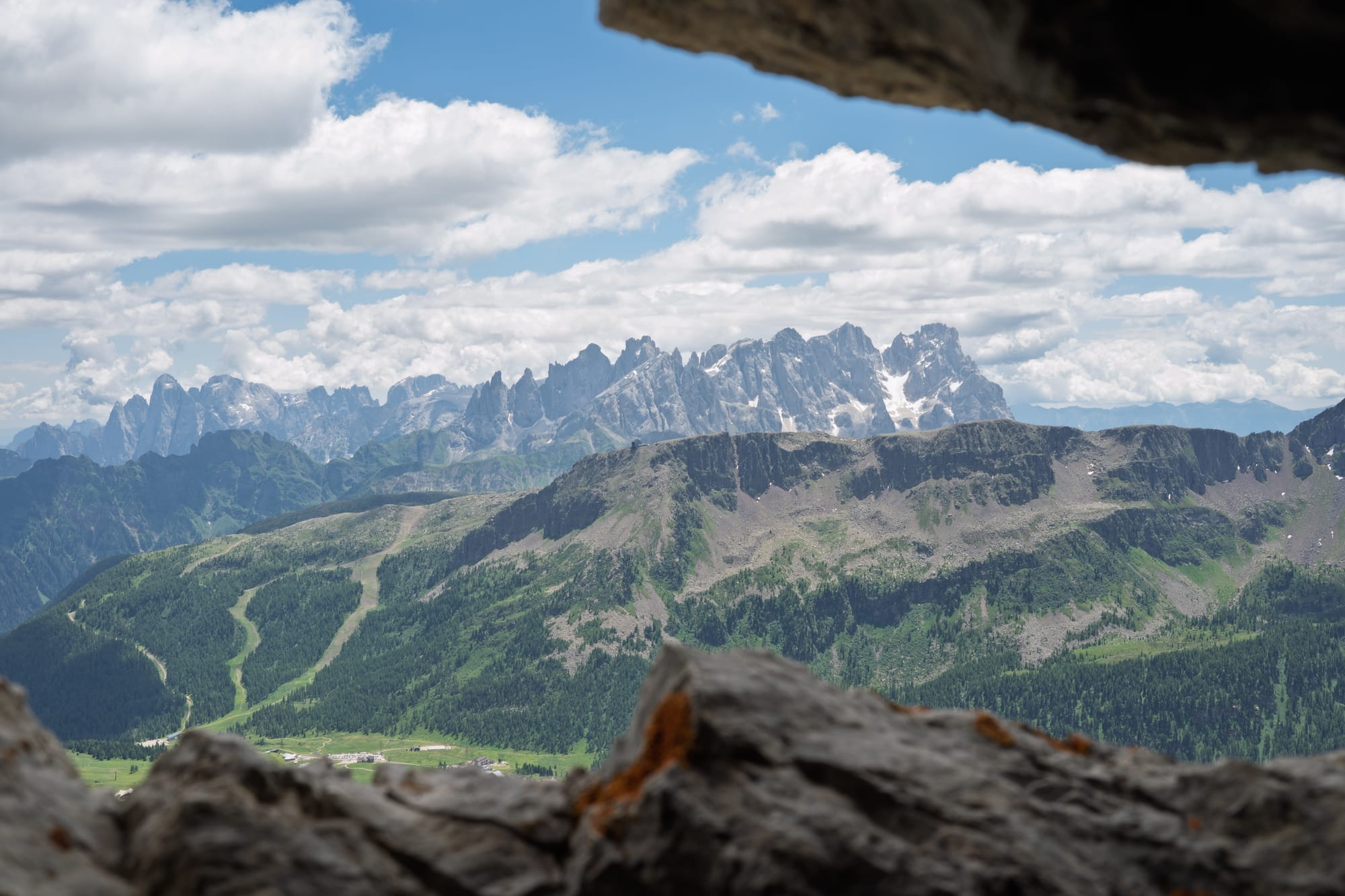 Lasciata Cima Campagnaccia, il tratto si fa più impegnativo. Seguendo l’attacco in quota, si cammina sulla sottile cresta tra pioli metallici e cavi d’acciaio: terreno sdrucciolevole, vento che spinge, attenzione massima richiesta. Sentieri consumati dal passaggio degli alpini nel 1916 si alternano a scale di legno sospese sul baratro, cenge naturali trasformate in tapezzerie panoramiche verso la Marmolada e il Latemar.