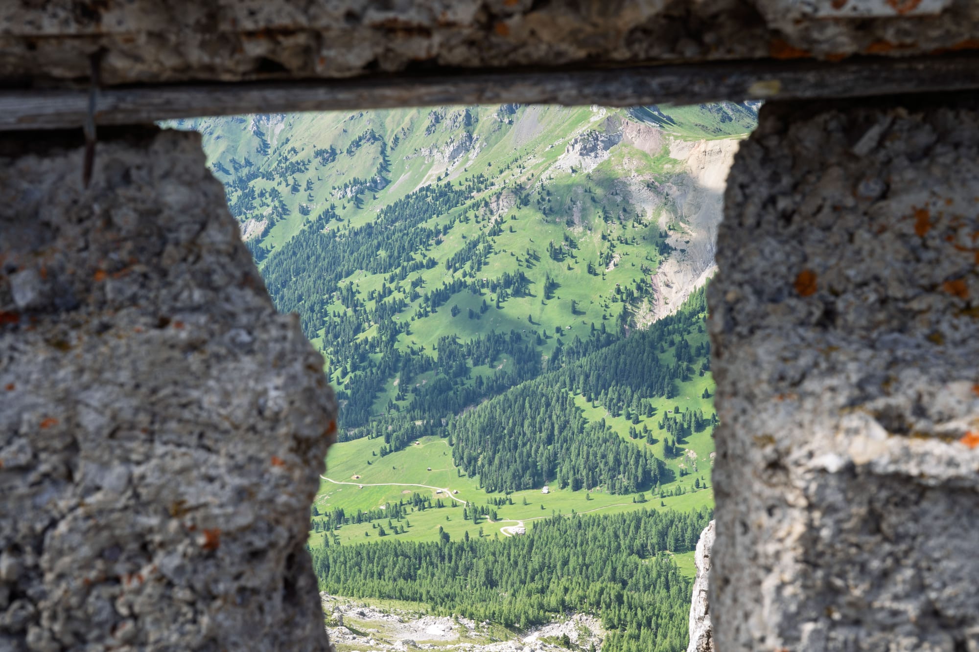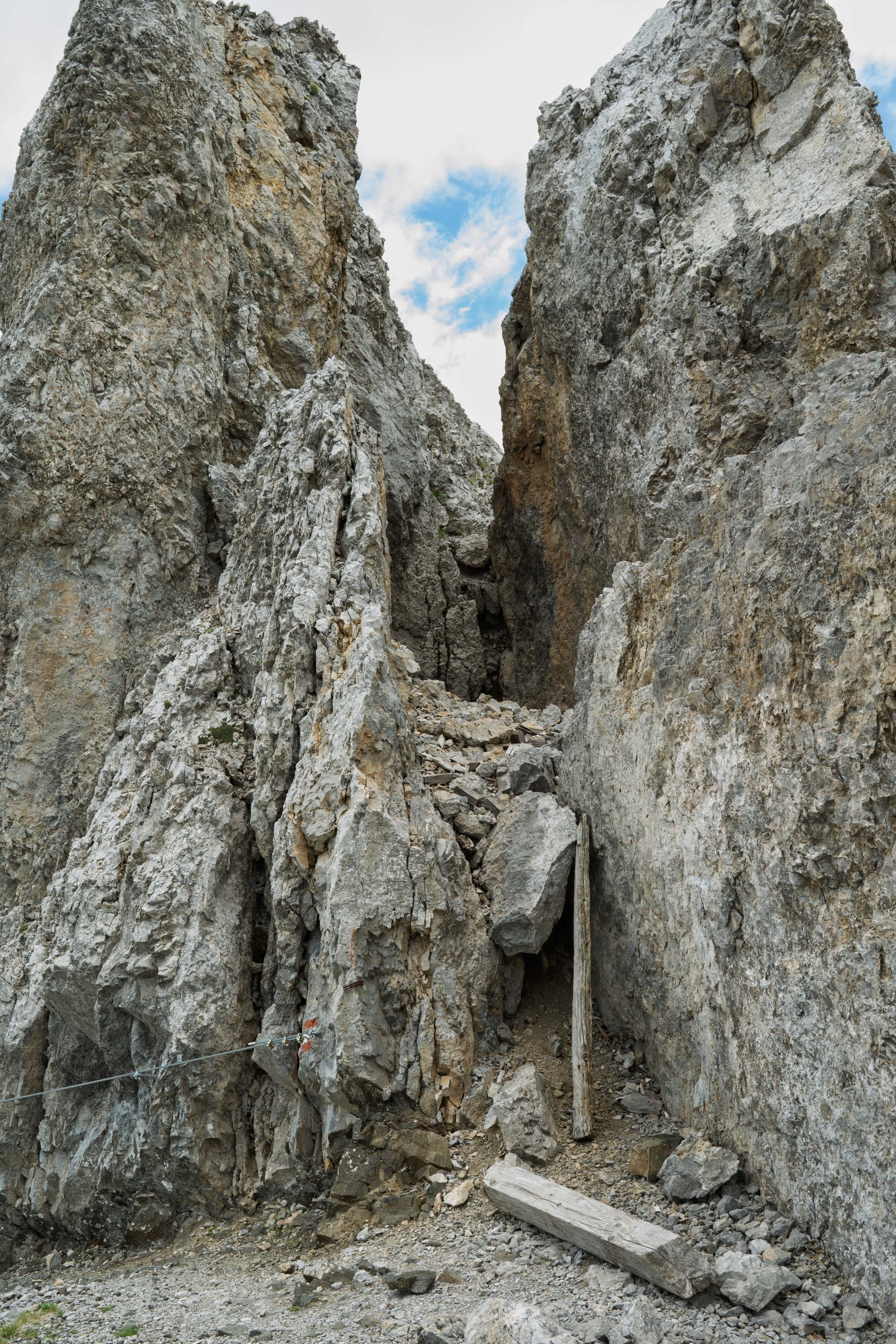 Il tratto successivo è una stretta forcella dove la ferrata si conclude. I pioli di ferro lasciano spazio a vecchie trincee, postazioni con feritoie, simboli di una guerra portata su sassi e neve. È un passaggio tra due epopee: da una parte, la vita adulta nella roccia, dall’altra, la quiete della natura che ricuce con muschi e licheni le ferite.