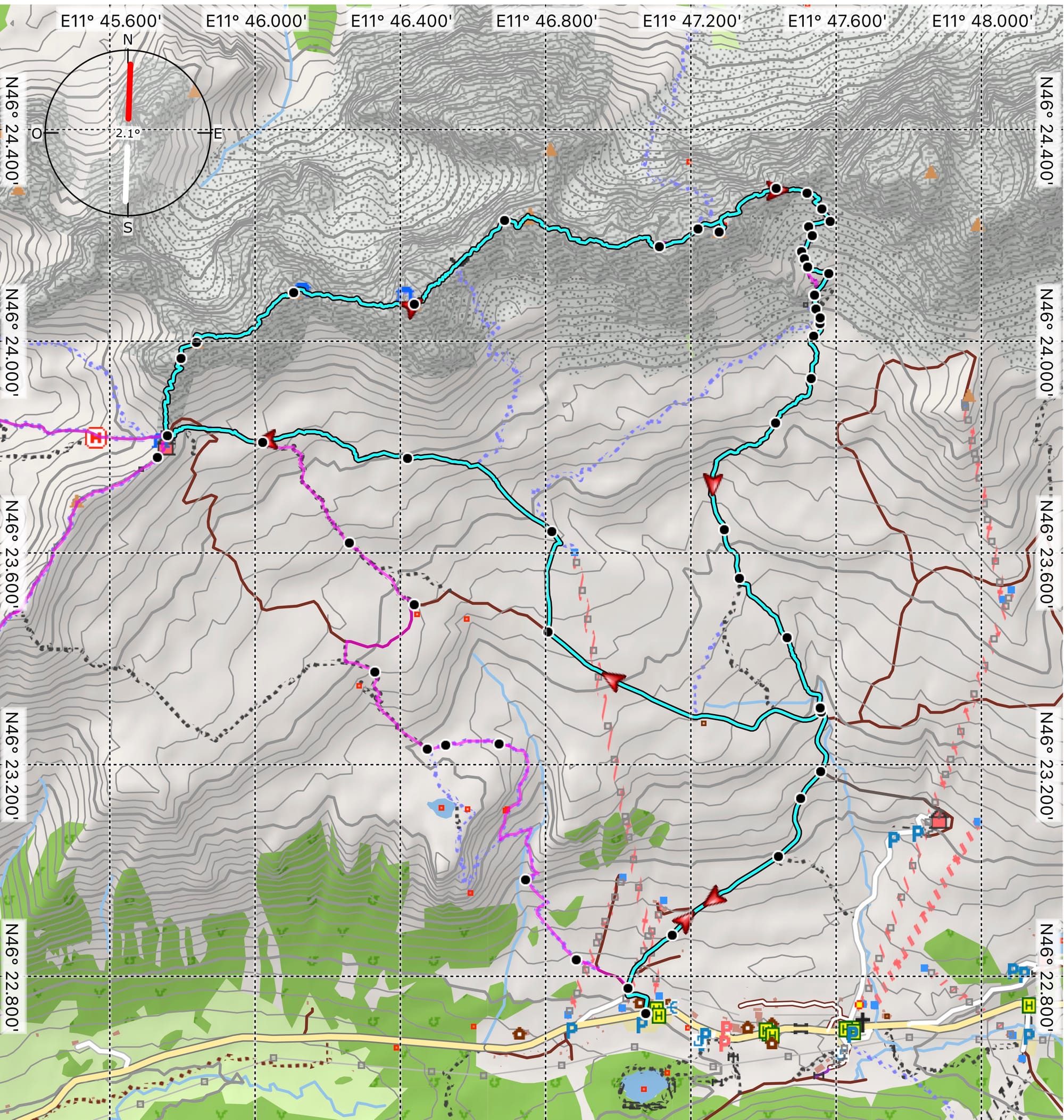 La mappa mostra chiaramente l’anello dal Passo San Pellegrino al Passo delle Selle, poi lungo la cresta fino alla Forcella Ciadin, e il rientro via CAI 604.