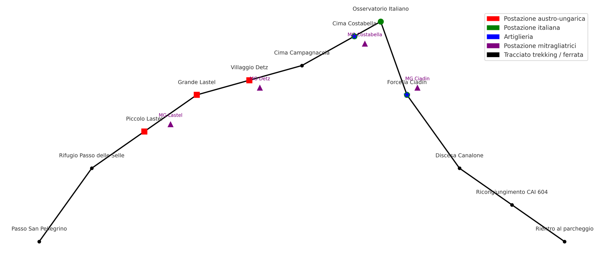 | 🪖 Presenza storica | Trincee, postazioni, gallerie austro-ungariche e italiane lungo la cresta della Costabella |