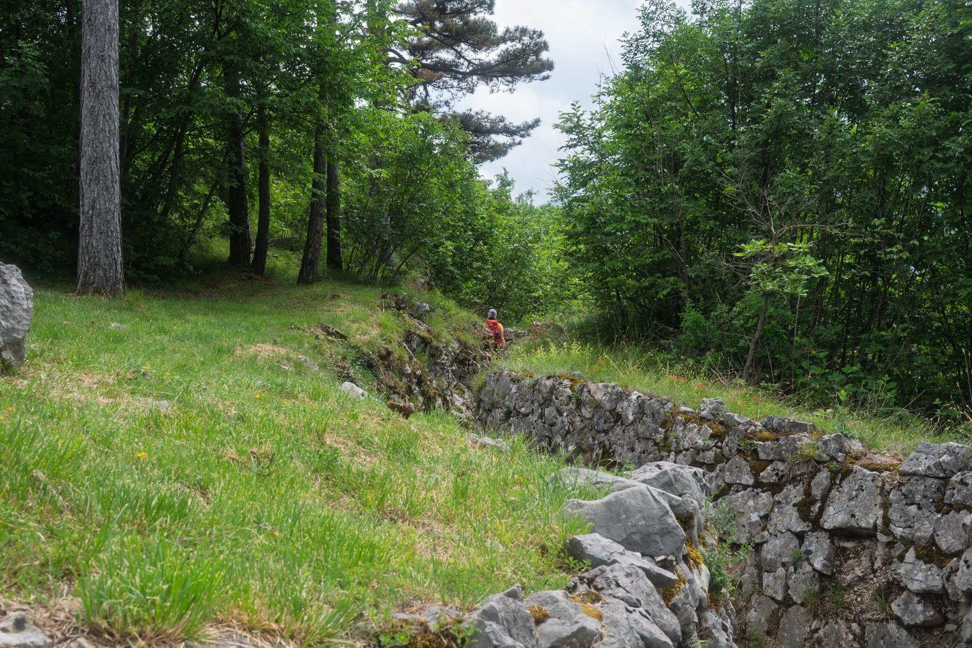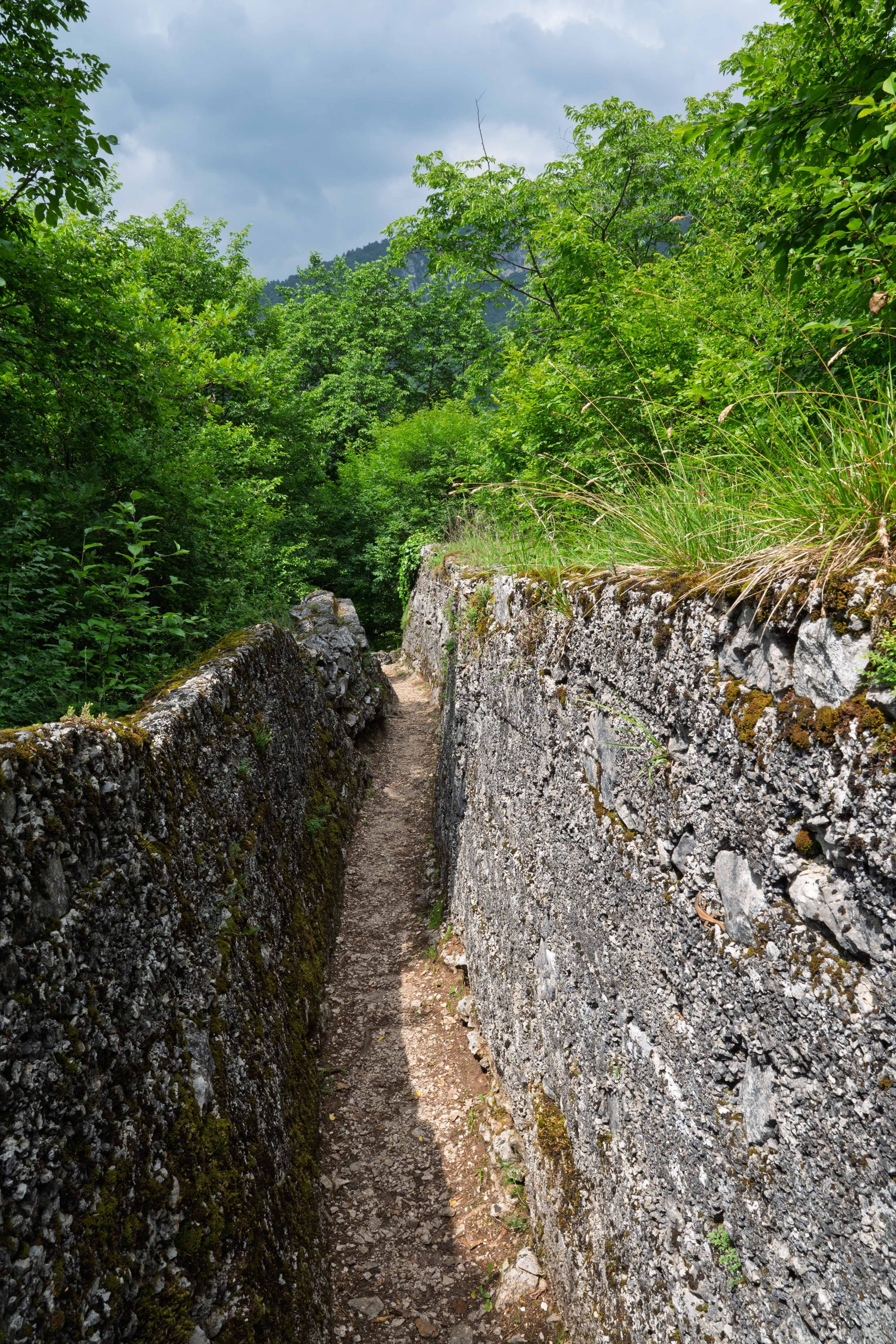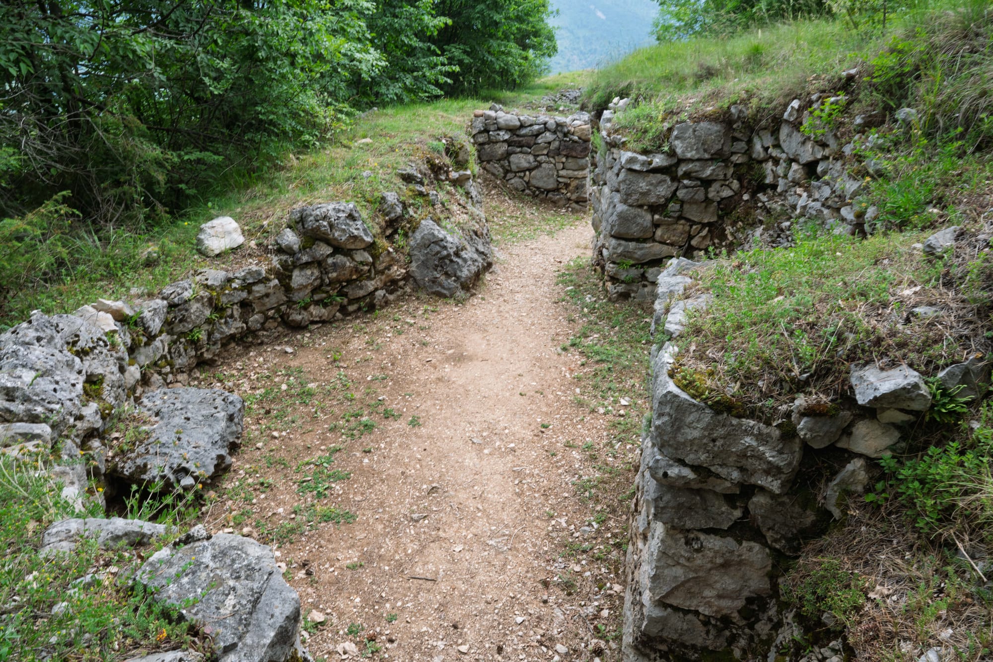 La trincea principale corre lungo la cresta. È scavata nel calcare, con scalini scolpiti e pareti consolidate da muretti a secco. Alcuni tratti sono così ben conservati che sembrano costruiti ieri da un plotone di ingegneri in pensione col pallino del restauro.