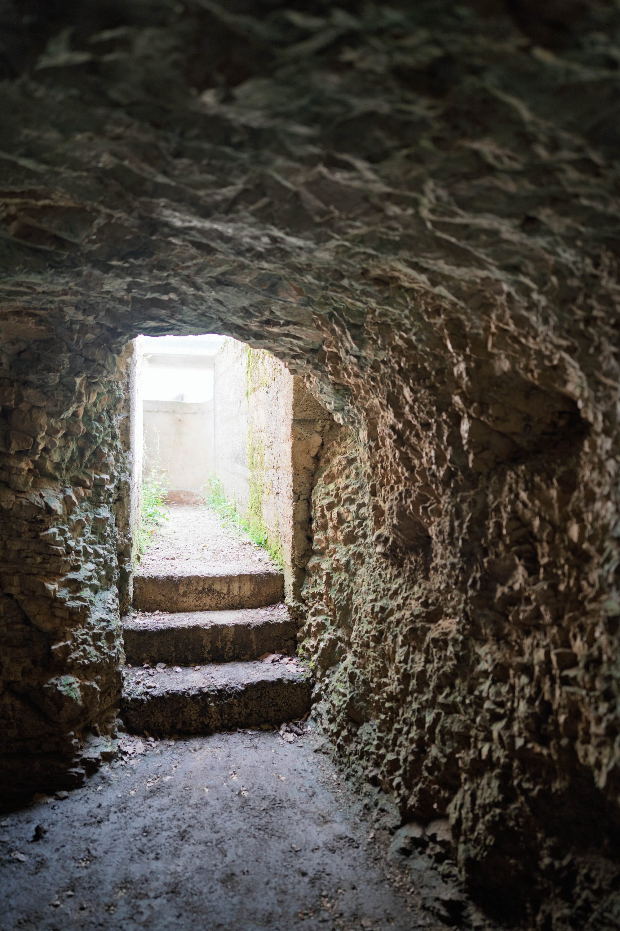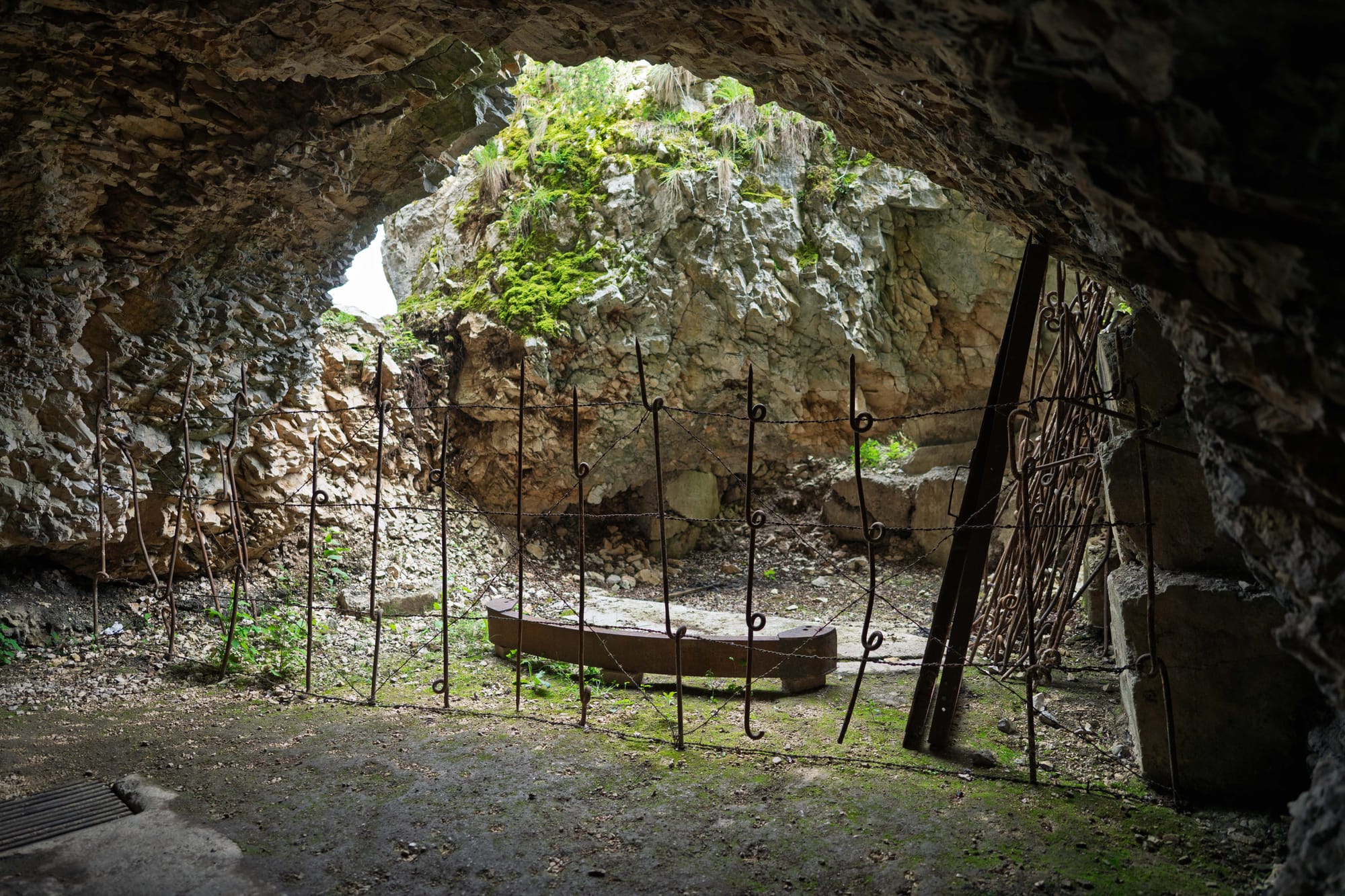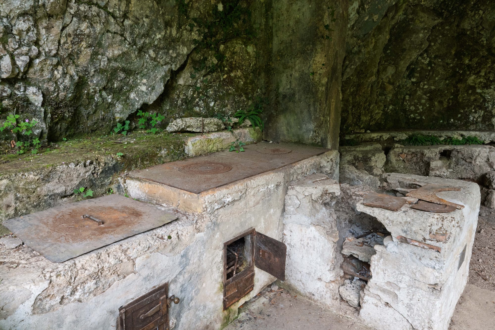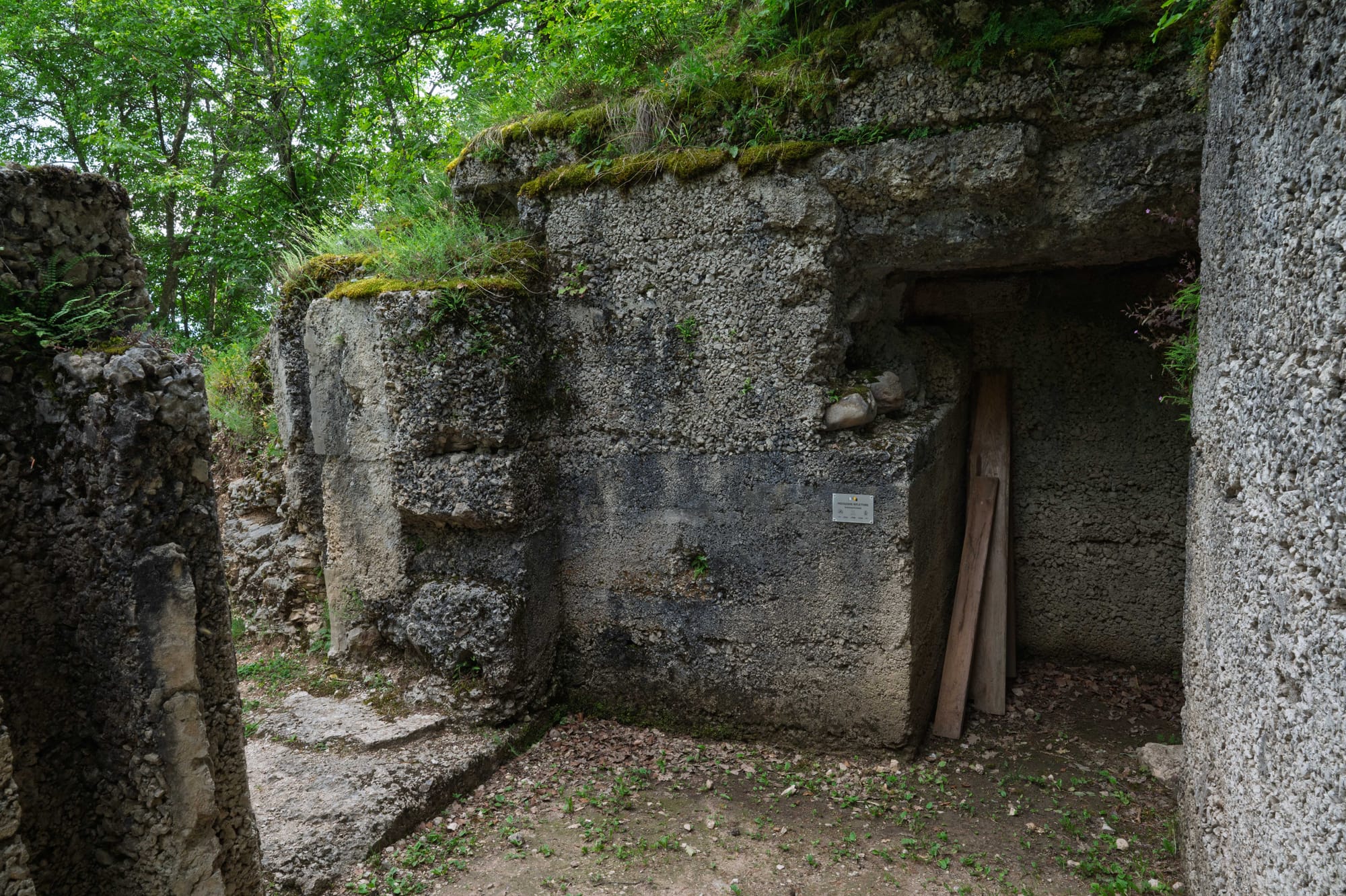 - ricoveri scavati nella roccia, umidi e claustrofobici, che dovevano ospitare una decina di uomini con tutto l’equipaggiamento (sì, pure la sveglia da campo e il cucchiaio della zuppa);