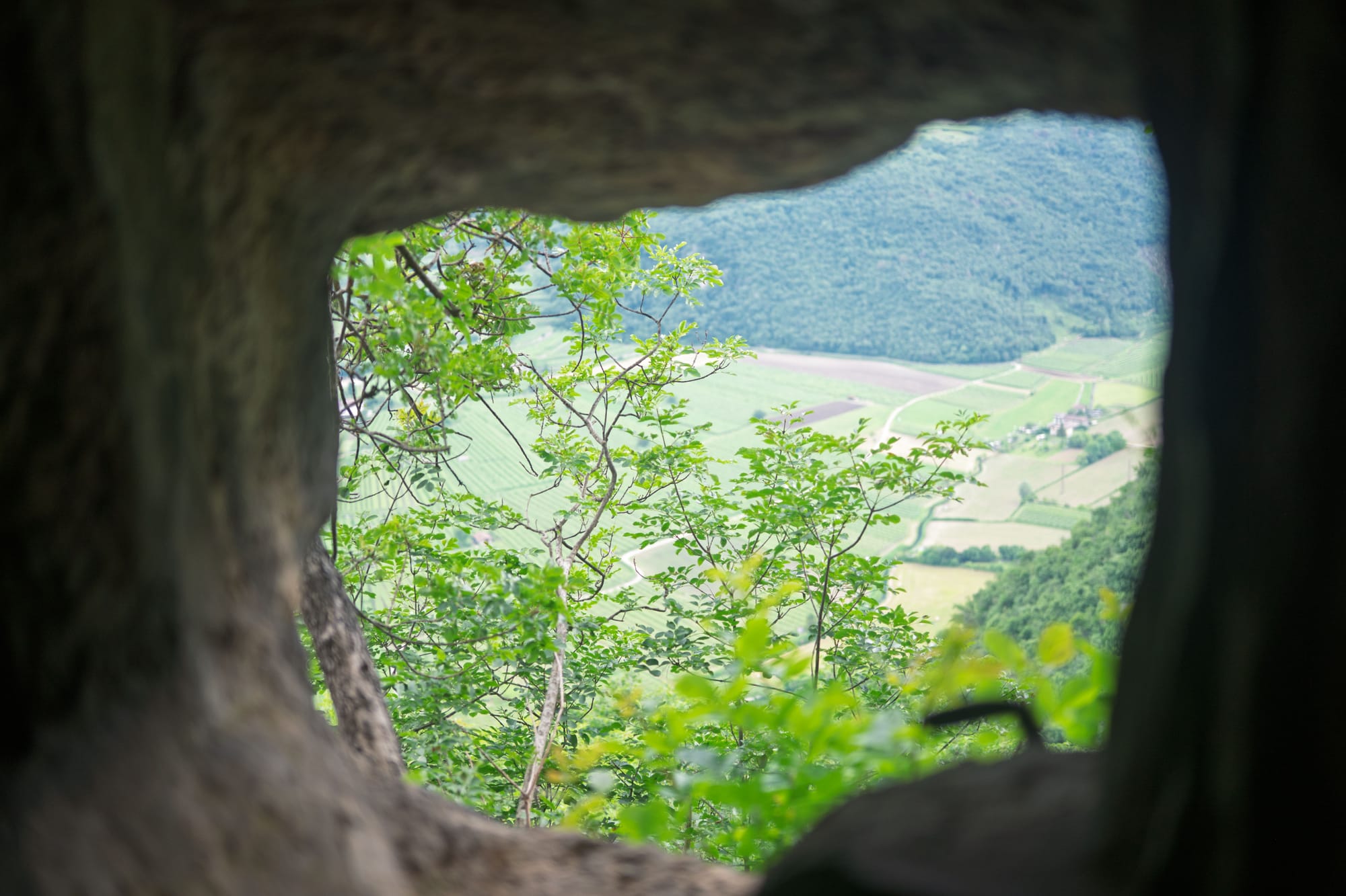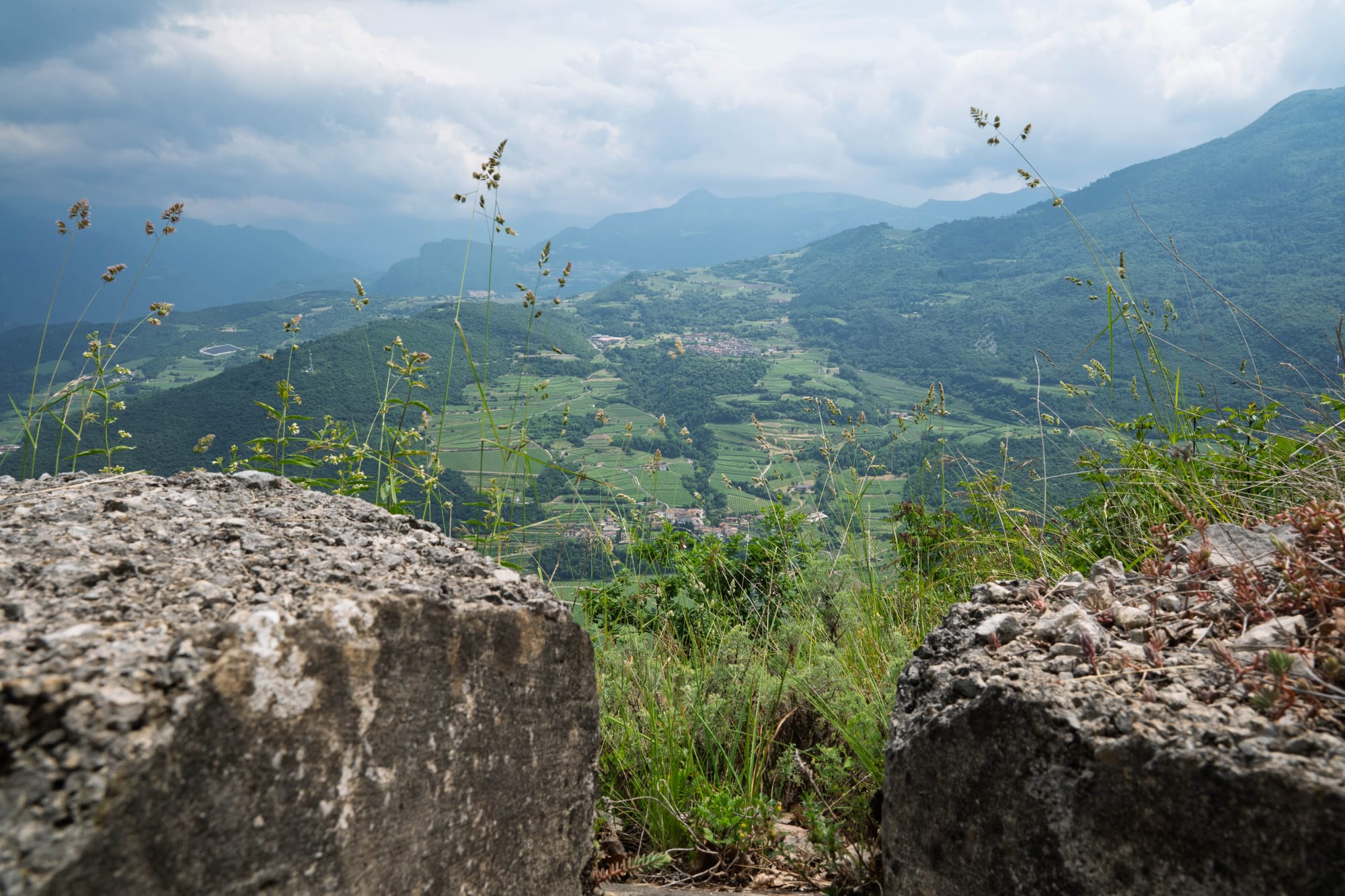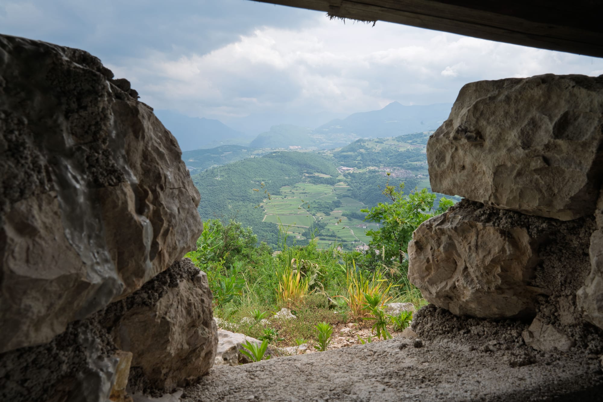 C’è un punto – indicato dai cartelli del percorso – dove la trincea si affaccia su un panorama mozzafiato. E non è un modo di dire da brochure turistica: qui si vede tutto. La Vallagarina si stende come un tappeto tra le montagne, l’Adige scintilla tra i filari, e Rovereto si intravede più a nord, come una cartolina rimasta incollata al paesaggio.
