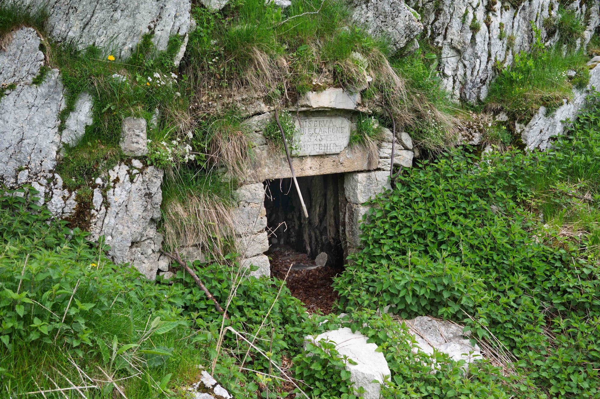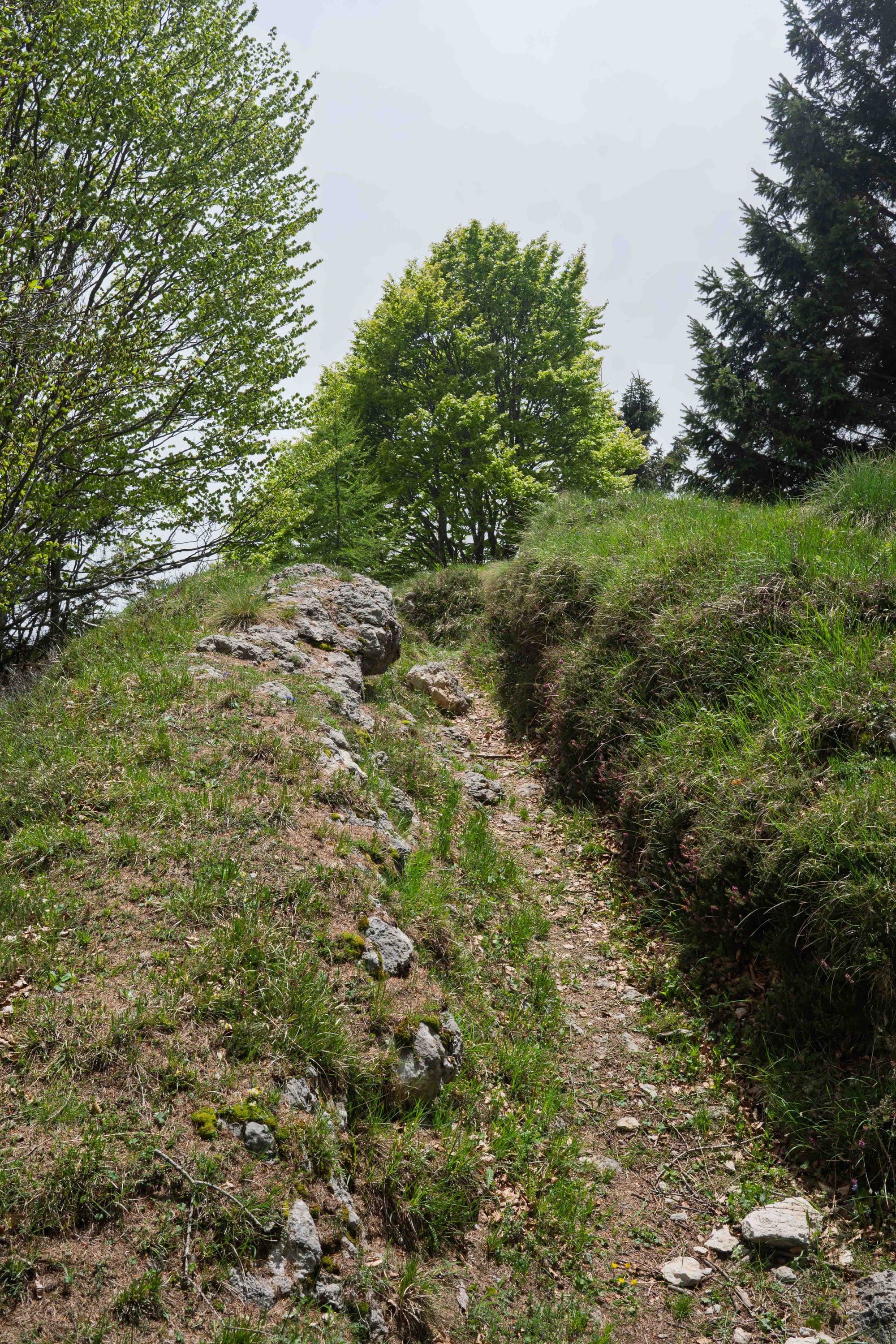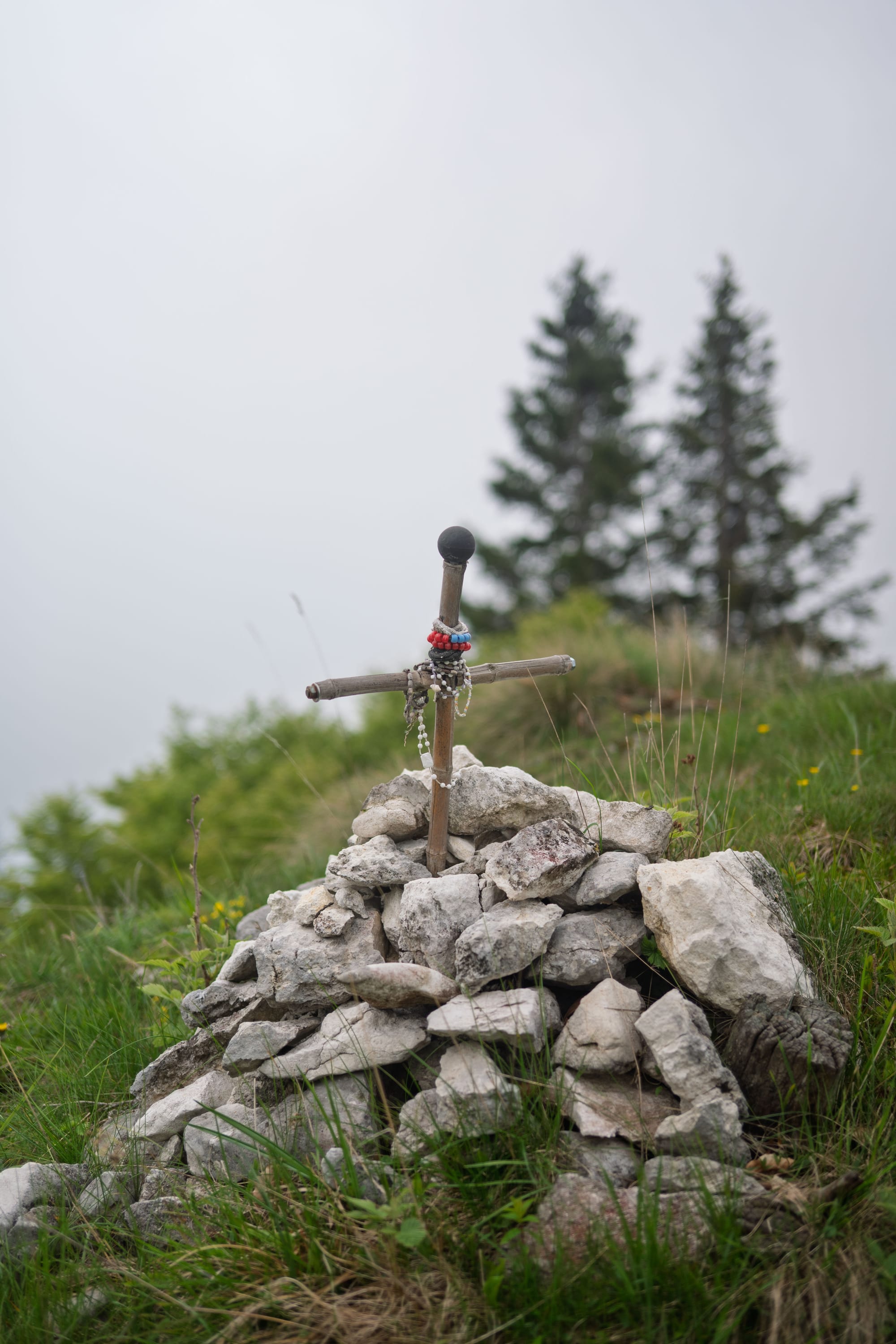 Man mano che si sale, il verde si intensifica, i rumori si attenuano e il sentiero si stringe. Ed è lì che iniziano a comparire le trincee vere e proprie. Alcune conservate benissimo, altre più timide, quasi nascoste tra l’erba. In un punto, sopra un cumulo di pietre, troviamo anche una piccola croce fatta con due bastoni, decorata da rosari ormai scoloriti. Un segno semplice ma toccante, che ti fa fermare un attimo e riflettere su chi ha camminato lì prima di noi, in tutt’altre condizioni.