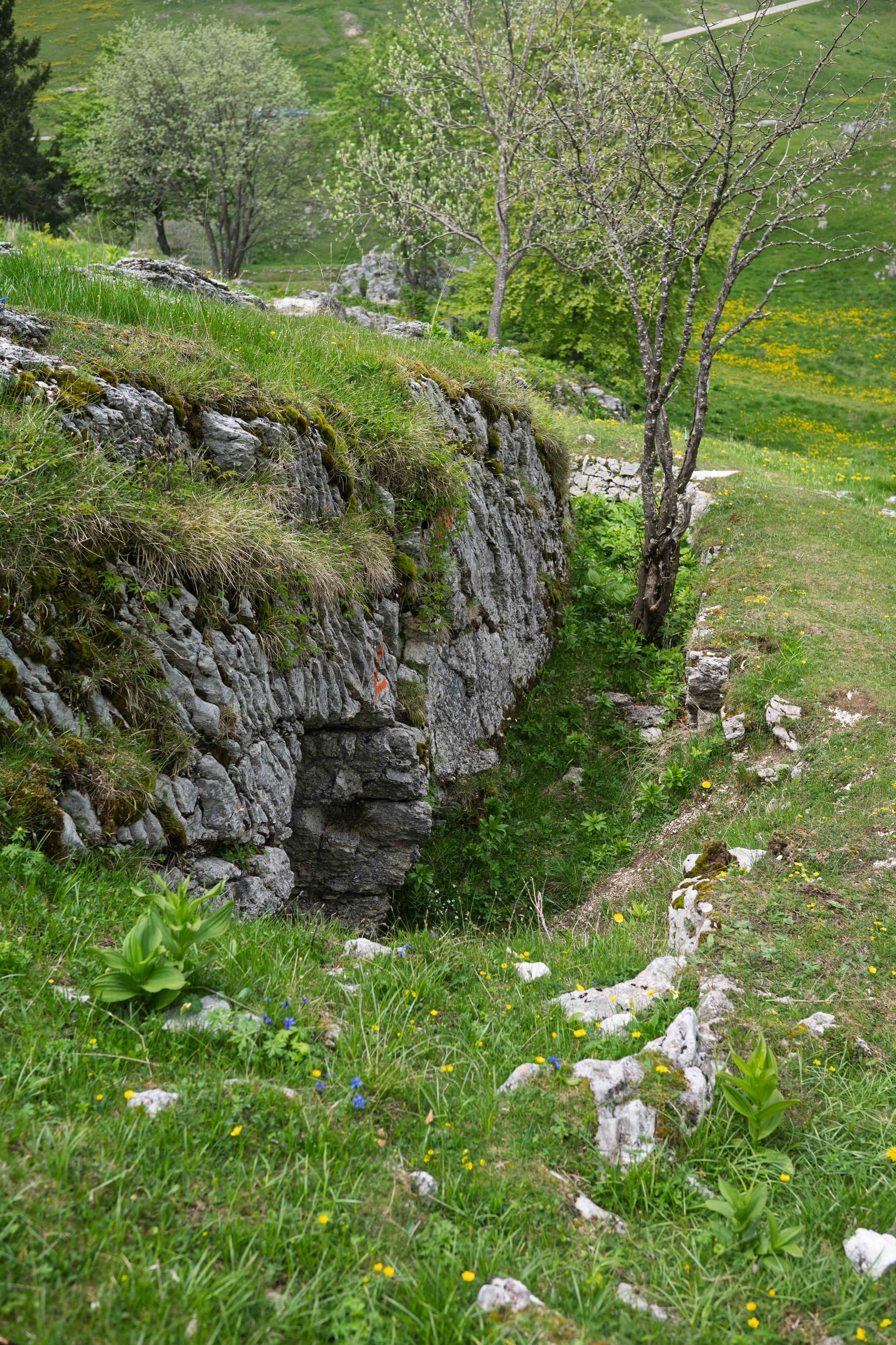 Scavate, consumate, alcune ancora protette da piccoli parapetti in pietra. Le trovi lungo il crinale, in mezzo ai prati, quasi a ricordarti che sì, qui si facevano le guerre, mica i picnic.