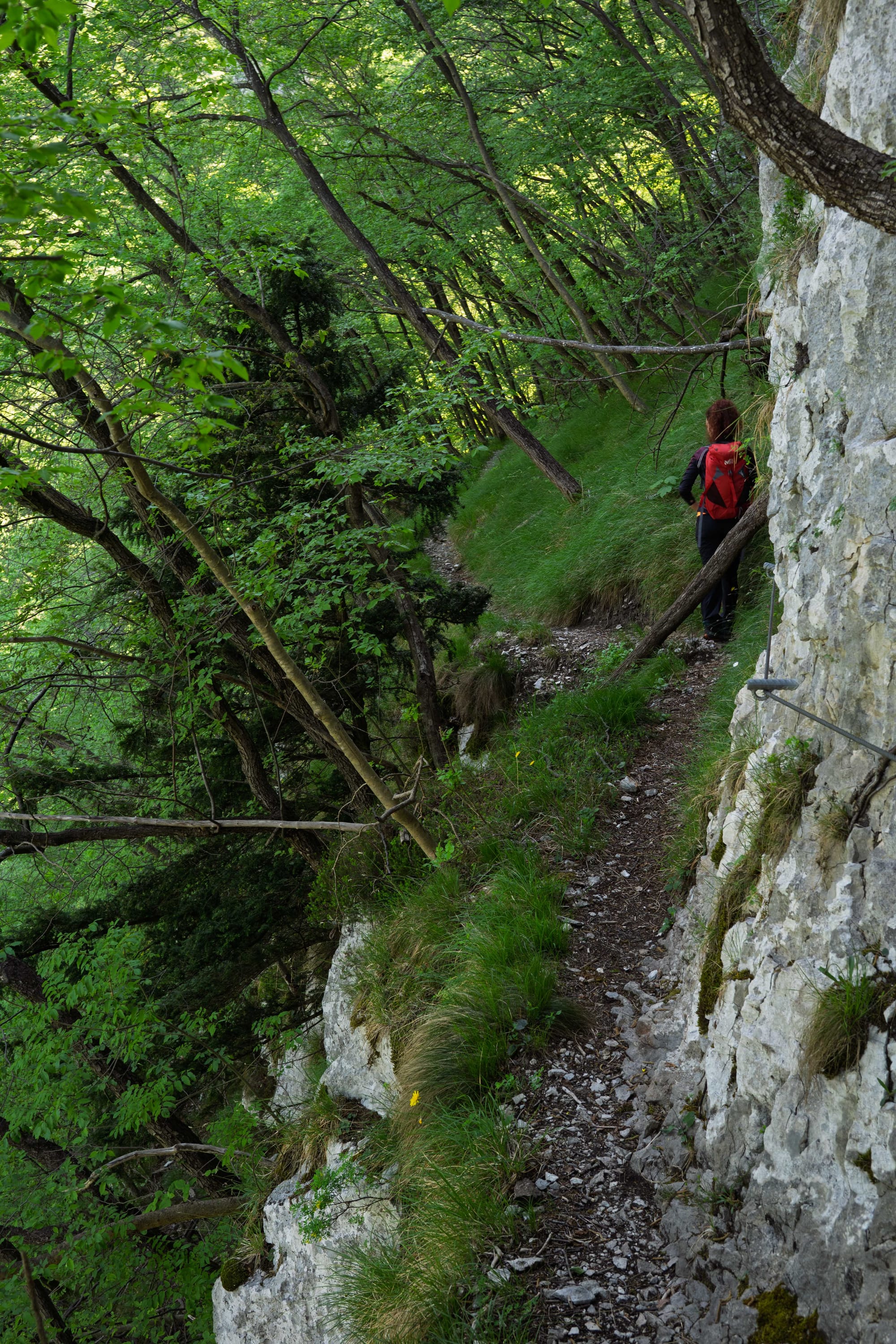 Partenza da Breonio, piccolo gioiello incastonato sopra Fumane. L’aria sa già di primavera piena, con quel mix di erba fresca, terra bagnata e fiori da cartolina. Dopo qualche passo, ci ritroviamo immersi nel bosco, sul cosiddetto “Sentiero Ciclamino”, che è poi la spina dorsale del percorso, con tratti che si intrecciano con il CAI 252 e, più avanti, con il CAI 240 (sì, quello con la targhetta bianco-rossa che fa molto “Indiana Jones versione veneta”).